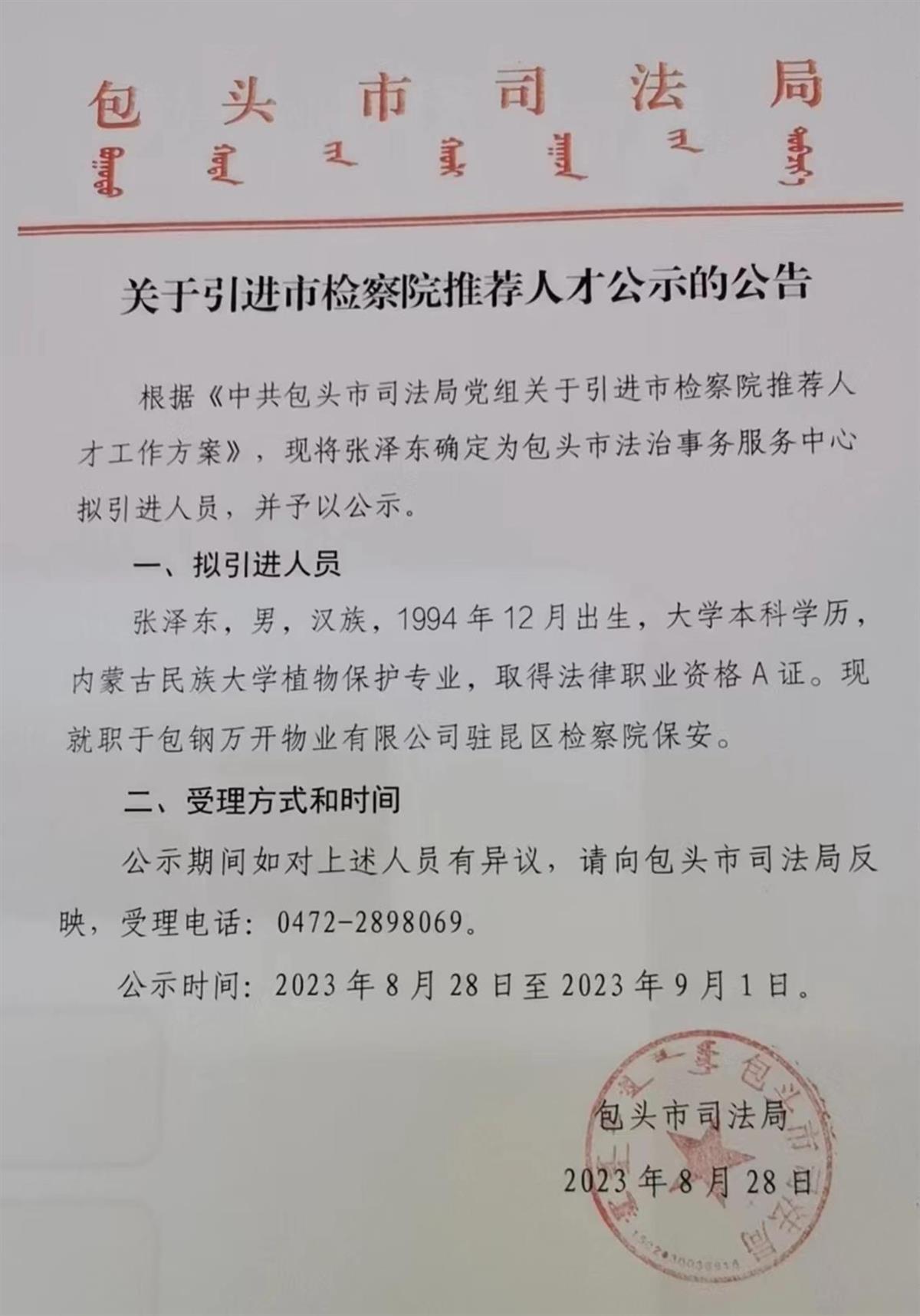 擬引進人員信息顯示,張澤東,男,漢族,1994 年12月出生,大學本科學歷,內蒙古民族大學植物保護專業,取得法律職業資格A證。現就職于包鋼萬開物業有限公司駐昆區檢察院保安。公示時間為2023年8月28日至2023年9月1日。