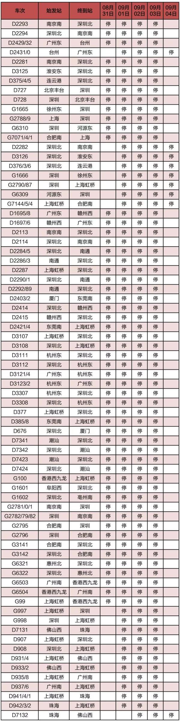 受臺風(fēng)“蘇拉”影響停運(yùn)動(dòng)車組列車信息表