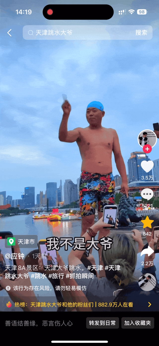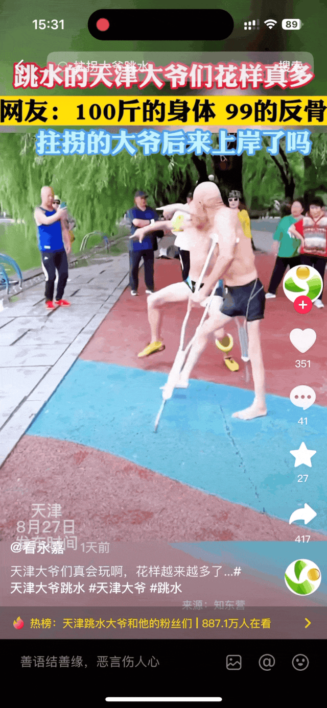 刷10條短視頻,有5條都是天津大爺花樣跳水,點開評論區,“觀眾席”頻頻發出感慨,“我這號算是練成了,一早上七八個天津大爺跳水”。