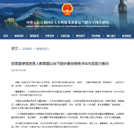 記者:英國議會下院外委會發布報告,宣稱中國對英國利益構成“威脅”,污蔑中國搞所謂“跨國鎮壓”,鼓吹對華搞“去風險”,還把臺灣稱作“獨立國家”。請問使館對此有何評論?