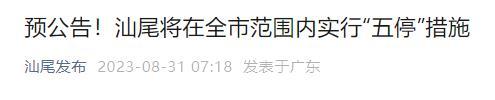 根據氣象、水文、海洋部門預測,今年第9號臺風“蘇拉”(超強臺風級)極大概率于9月1日在汕尾正面登陸,風力強度可能超過2013年天兔臺風,海域4至6米巨浪、狂浪,風暴潮增水大,伴隨大暴雨到特大暴雨,防御形勢極其嚴峻。為全力保障人民群眾生命財產安全,我市將于8月31日適時啟動防臺風Ⅰ級應急響應。經市委市政府同意,市三防指揮部計劃于9月1日零時起到防臺風Ⅰ級應急響應結束之前,在全市范圍內實行“五停”措施(即:停課、停工、停產、停運、停業)。現將有關重點事項通知如下: