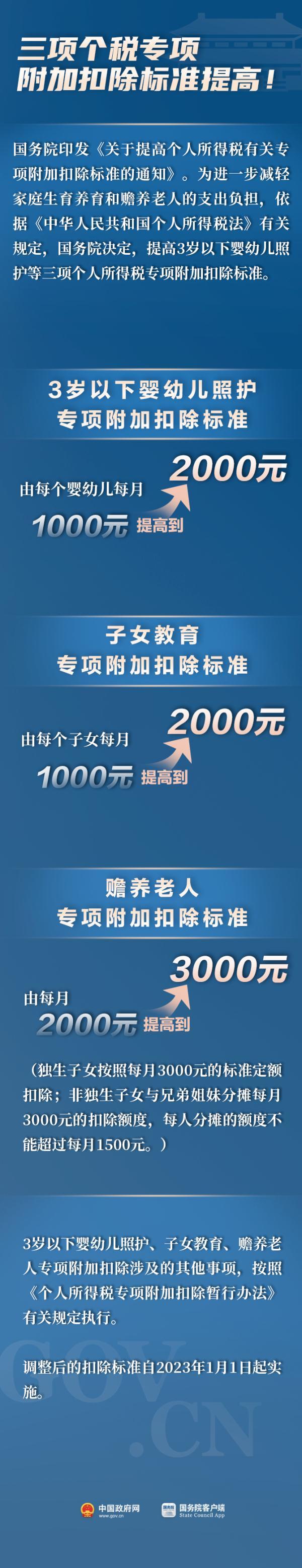 為進(jìn)一步減輕家庭生育養(yǎng)育和贍養(yǎng)老人的支出負(fù)擔(dān),依據(jù)《中華人民共和國(guó)個(gè)人所得稅法》有關(guān)規(guī)定,國(guó)務(wù)院決定,提高3歲以下嬰幼兒照護(hù)等三項(xiàng)個(gè)人所得稅專(zhuān)項(xiàng)附加扣除標(biāo)準(zhǔn)。現(xiàn)將有關(guān)事項(xiàng)通知如下: