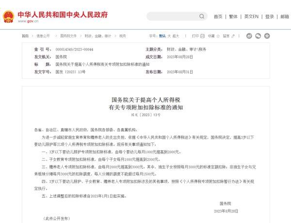 國(guó)務(wù)院關(guān)于提高個(gè)人所得稅有關(guān)專(zhuān)項(xiàng)附加扣除標(biāo)準(zhǔn)的通知