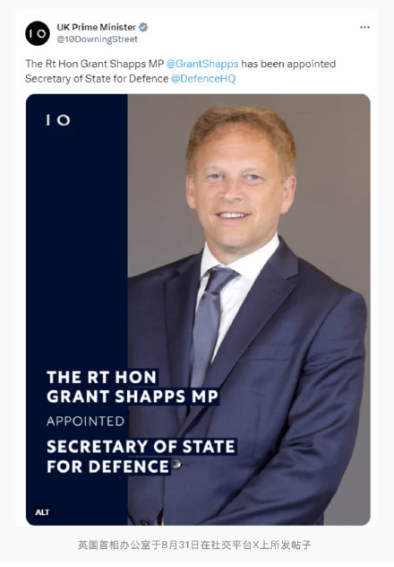 據英國天空新聞網最新報道,英國首相辦公室8月31日在社交平臺上X(原推特)稱,格蘭特·沙普斯已被任命為英國國防大臣。