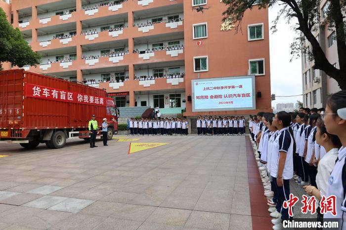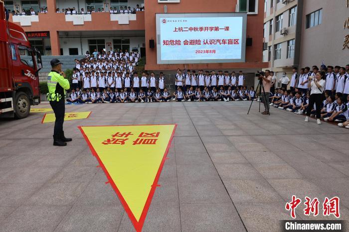 中新網(wǎng)福建上杭8月31日電 (李新元 胡欽培)31日,福建省龍巖市上杭縣公安局交通警察大隊民警將貨車“搬進”校園,開展以“知危險會避險,認識汽車盲區(qū)”為主題的交通安全宣傳體驗活動,為該縣第二中學(xué)的高一新生們上了一堂生動的開學(xué)第一課。