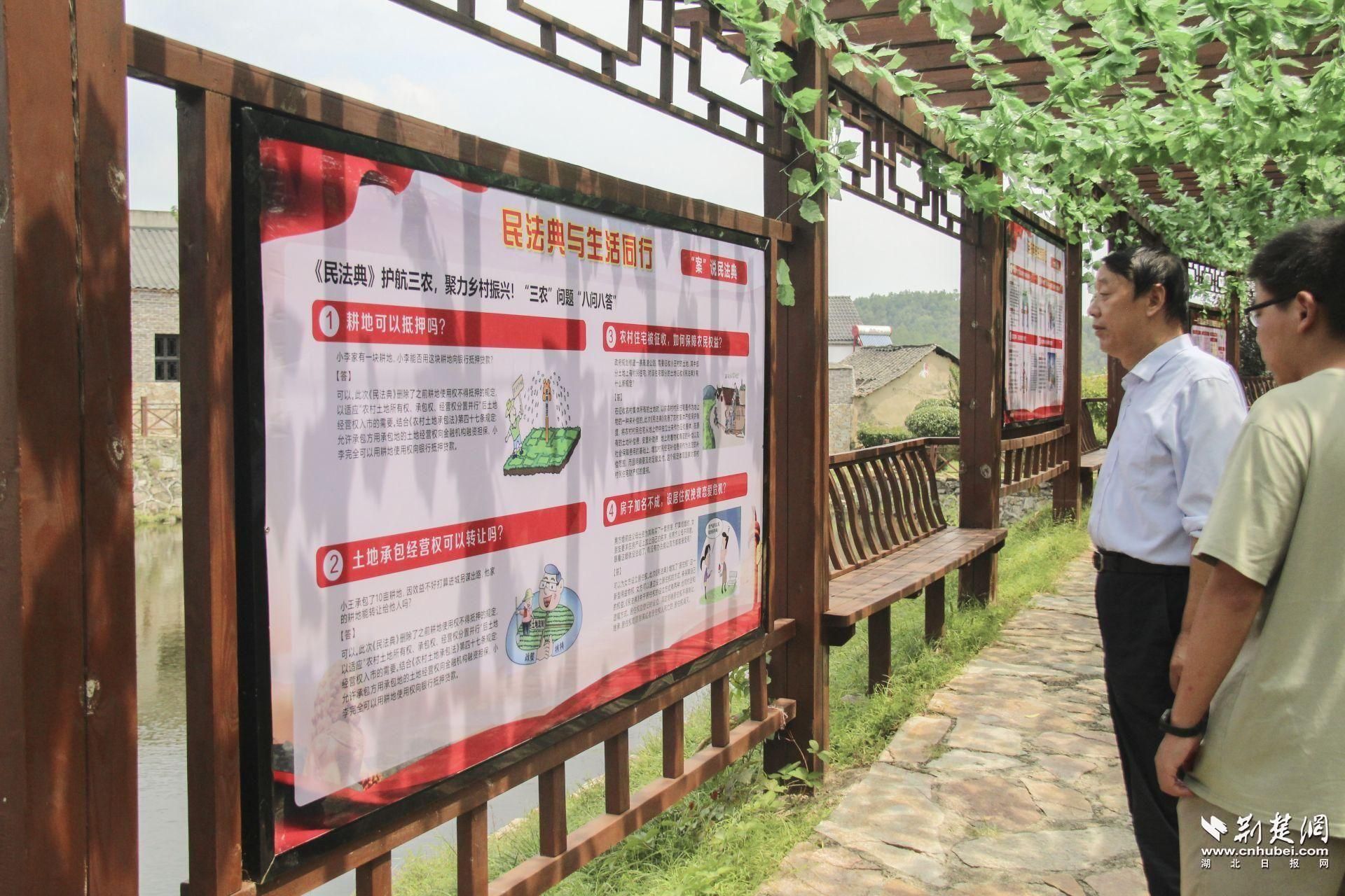 在鄂豫皖蘇區中心烈士陵園所在地、紅軍團長方和明的故鄉七里坪鎮八一村,“荊楚民生觀察團”參觀了村內法治文化長廊、法治課堂、調解室以及其他紅色法治陣地。接著,“荊楚民生觀察團”與黃岡市司法局、紅安縣委宣傳部、麻城市司法局、紅安縣司法局等有關人員座談。