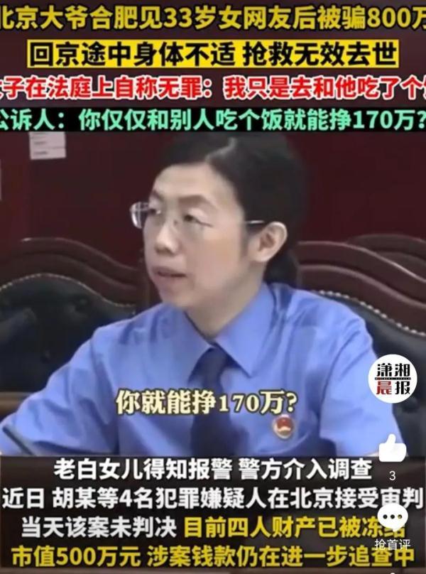 近日,胡某等4名犯罪嫌疑人在北京受審。庭審上,女子否認詐騙,稱“我只是去吃了個飯,他們是讓我以胡靜的名義去的。”法官當場質問:“你僅僅是和別人吃個飯,就能賺170萬元?”該案未當庭宣判,目前4人財產已被凍結,市值500萬元,涉案錢款仍在進一步追查中。