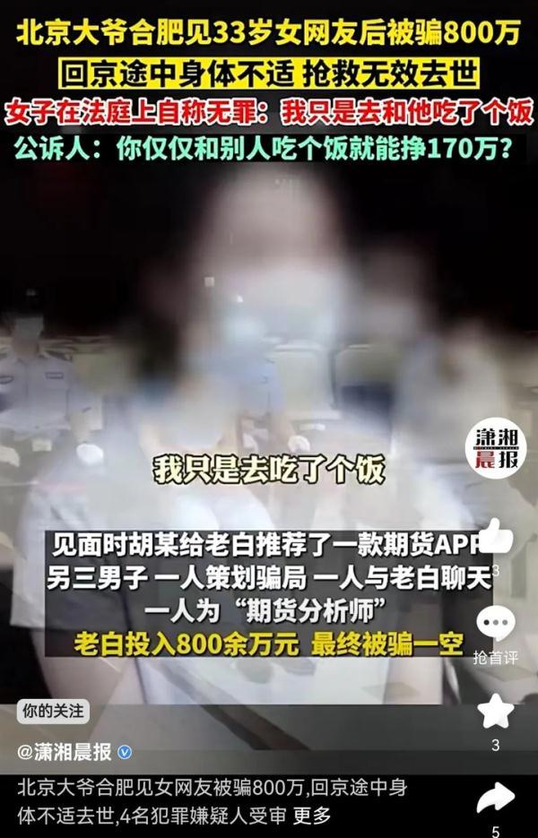 原來,老白在網上認識了33歲女子“胡靜”,雙方很快陷入戀愛。2022年,老白赴合肥與其見面,掉進了4名騙子設下的圈套。女子胡某以胡靜的身份負責與老白見面吃飯,見面時胡某給老白推薦了一款期貨APP,另外三名男子一人策劃騙局,一人與老白聊天,一人為“期貨分析師”。老白先后投入了800余萬元。老白女兒得知后報警,警方已介入調查。