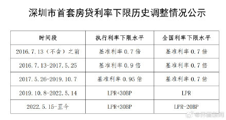 9月1日,央行深圳市分行公示深圳市首套房貸利率下限歷史調整情況。2022.5.15-至今,深圳執行利率下限水平為LPR+30BP,全國利率下限水平為LPR-20BP。