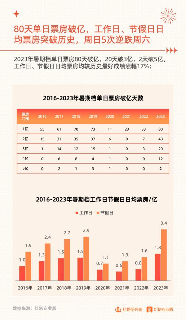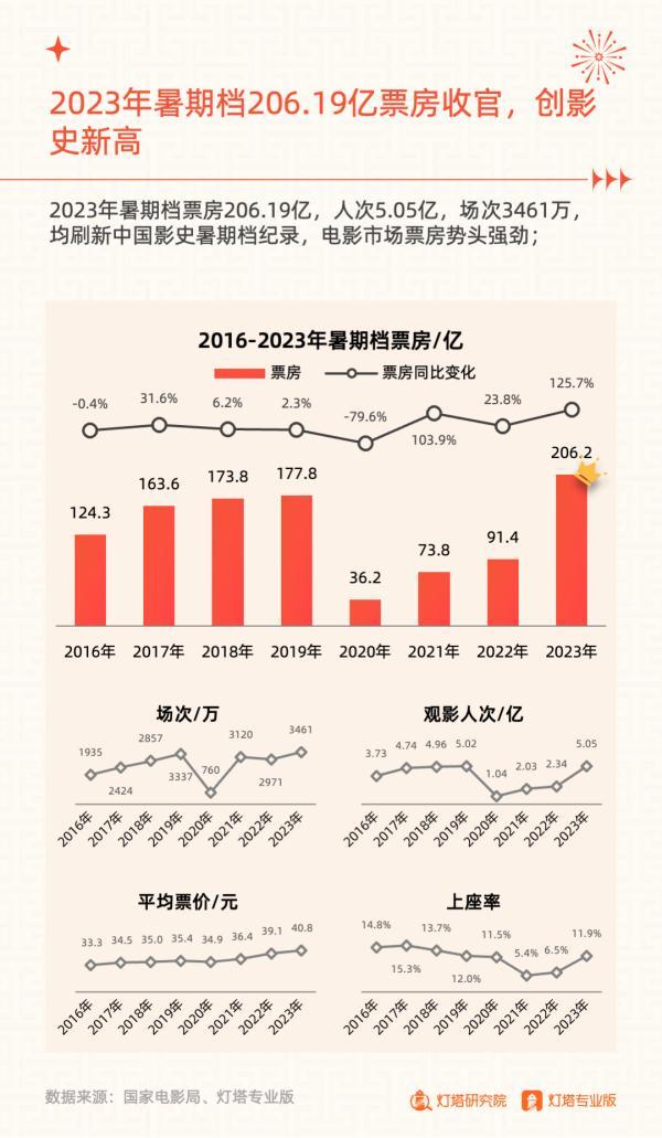 2023年暑期檔電影票房206.19億元,同比增長125.7%,觀影人次為5.05億,場次為3461萬,票房、觀影人次、場次均刷新中國影史暑期檔紀錄。