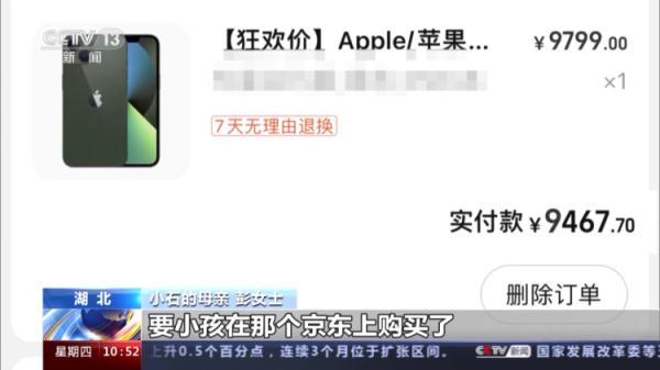 小石的母親 彭女士:要小孩在那個京東上購買了一共是11部蘋果手機,每一部大概是9000多塊,將近10萬塊,后面又通過微信給銀行轉賬,轉走了28000塊。