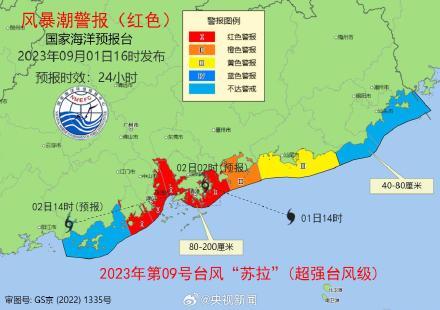 蘇拉正逼近粵東沿海地區(qū),國家海洋預報臺將風暴潮警報升級為紅色,并同時繼續(xù)發(fā)布海浪紅色警報。這是今年針對臺風引發(fā)海洋災害發(fā)布的首份風暴潮、海浪雙紅警報。根據(jù)實況數(shù)據(jù),超強臺風蘇拉的危險半圓將橫掃香港和深圳。一定注意安全!(總臺央視記者李卉)