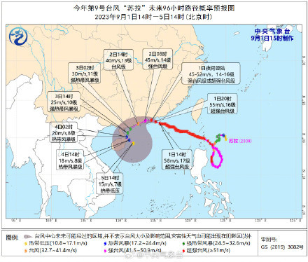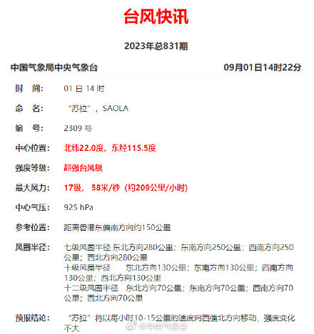 “蘇拉”有可能成為1949年以來登陸珠三角地區(qū)的最強(qiáng)臺(tái)風(fēng)!9月1日下午14時(shí),超強(qiáng)臺(tái)風(fēng)“蘇拉”中心附近最大風(fēng)力17級(jí)(58米/秒)。預(yù)計(jì),“蘇拉”將以每小時(shí)10~15公里的速度向西偏北轉(zhuǎn)偏西方向移動(dòng),將于今天夜間到明天上午以強(qiáng)臺(tái)風(fēng)級(jí)或超強(qiáng)臺(tái)風(fēng)級(jí)在廣東惠東到臺(tái)山一帶沿海登陸,也不排除在廣東中部近岸海面向西偏南方向移動(dòng)的可能。(中央氣象臺(tái))