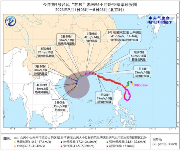 中央氣象臺9月1日10時繼續(xù)發(fā)布臺風(fēng)紅色預(yù)警:今年第9號臺風(fēng)“蘇拉”(超強(qiáng)臺風(fēng)級)的中心9月1日上午10點(diǎn)鐘位于香港東偏南方大約215公里的南海東北部海面上。預(yù)計,“蘇拉”將以每小時10-15公里的速度向西偏北轉(zhuǎn)偏西方向移動,將于9月1日夜間到2日上午在廣東惠東到臺山一帶沿海登陸(強(qiáng)臺風(fēng)級或超強(qiáng)臺風(fēng)級,45-52米/秒,14-16級),也不完全排除在廣東中部近岸海面向西偏南方向移動的可能。