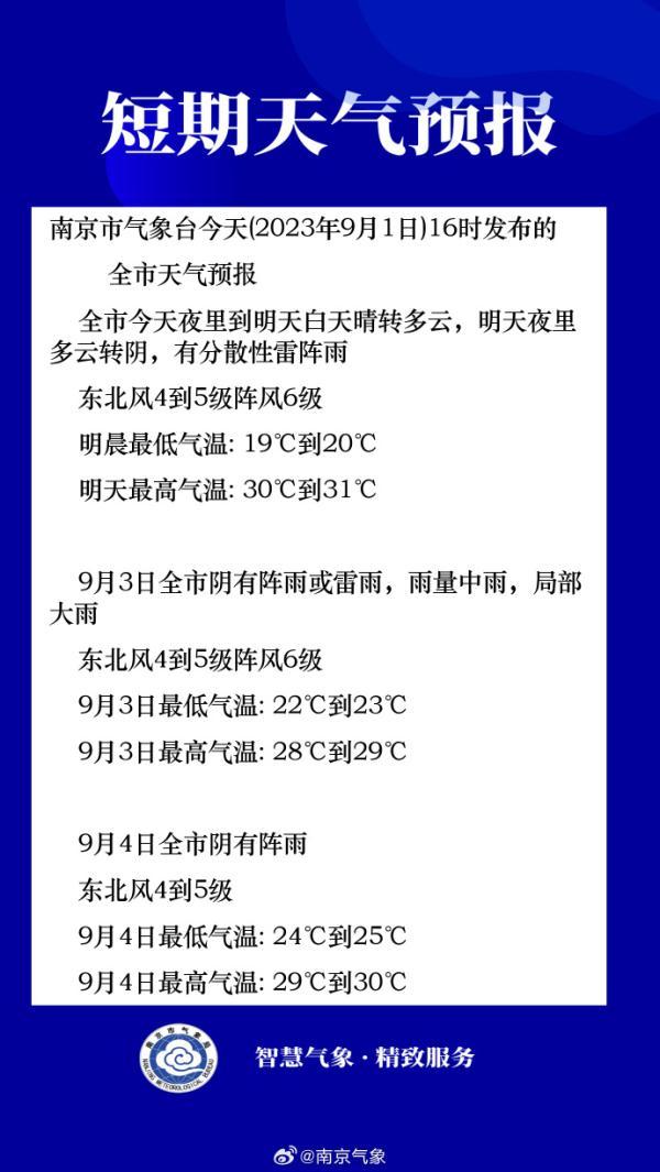 另據(jù)南京市氣象臺,明天夜里南京將會有分散性雷陣雨。9月3日,全市陰有陣雨或雷雨,雨量中雨,局部大雨。