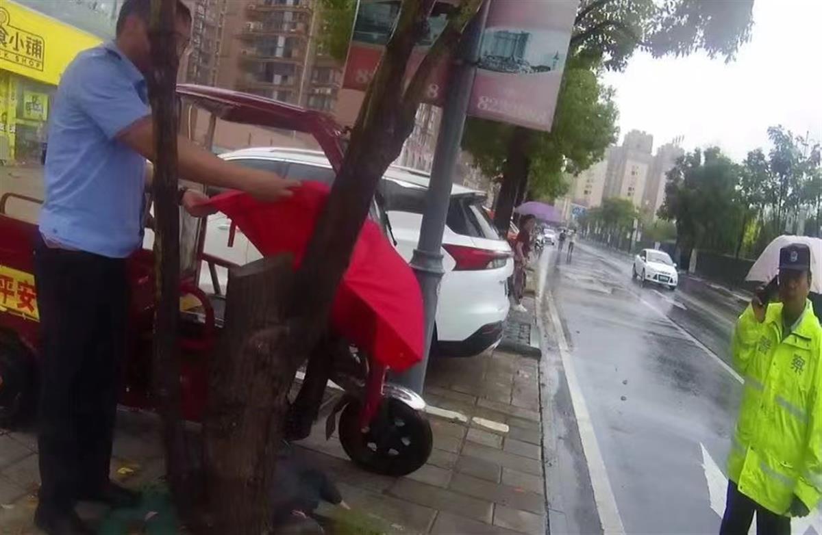 到達現(xiàn)場后,民警發(fā)現(xiàn)一名老大爺躺在街面,衣服已被雨水淋濕,民警趕忙上前為其撐傘。民警詢問老人是否受傷、家住哪里,然而,老人雖處于清醒狀態(tài),但一直沉默不語,似乎也無法動彈。為安全起見,民警沒有貿(mào)然移動老人,而是在雨中為老人撐起了一把“守護傘”。