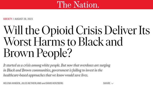 隨著阿片類藥物成癮危機轉變為阿片類藥物過量危機,美國當局和衛生部門為新確認的處方阿片類藥物“濫用者”群體制定了一種新的基于醫療保健而不是懲罰性的成癮辦法,最顯著的特點是增加治療,尤其是藥物輔助治療。這些新政策或明或暗都被標榜為拯救白人的方式,這一點在實施過程中很容易看出。例如,根據2019年發表在《美國醫學會雜志· 精神病學》(JAMA Psychiatry)上的一項研究,丁丙諾啡是一種長效阿片類藥物,可以在常規醫療實踐中開處方,以穩定和規范消費,絕大多數是開給白人的。黑人和棕色人種大多能接觸到化學成分相似但使用時間較長且受到懲罰性監管的美沙酮。