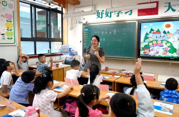 9月1日,西安市新城區后宰門小學一年級啟明星班的學生在老師帶領下進行課堂互動。