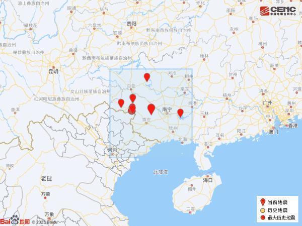 歷史地震:根據中國地震臺網速報目錄,震中周邊200公里內近5年來發生3級以上地震共11次,最大地震是2019年11月25日在廣西百色市靖西市發生的5.2級地震(距離本次震中98公里),歷史地震分布如圖。