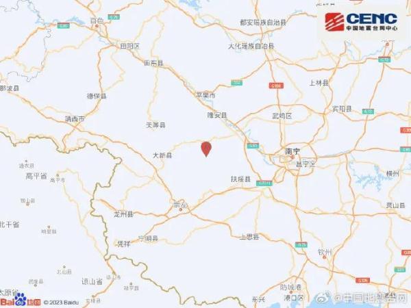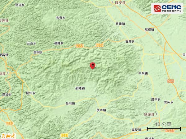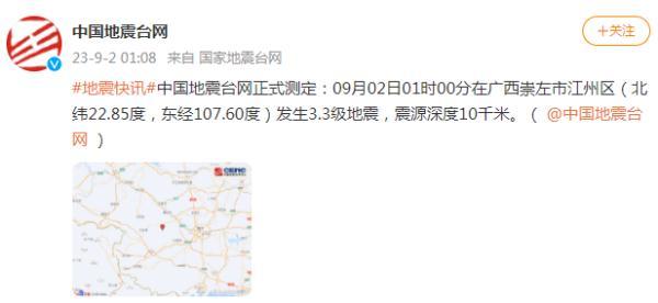 據中國地震臺網中心官方微博9月2日消息,中國地震臺網正式測定:09月02日01時00分在廣西崇左市江州區(北緯22.85度,東經107.60度)發生3.3級地震,震源深度10千米。