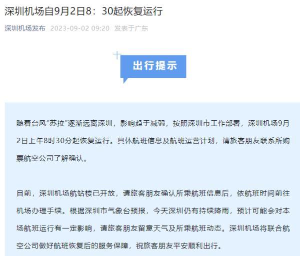 深圳機場9月2日上午8時30分起恢復運行