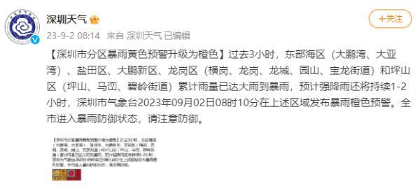 【深圳市分區暴雨黃色預警升級為橙色】過去3小時,東部海區(大鵬灣、大亞灣)、鹽田區、大鵬新區、龍崗區(橫崗、龍崗、龍城、園山、寶龍街道)和坪山區(坪山、馬巒、碧嶺街道)累計雨量已達大雨到暴雨,預計強降雨還將持續1-2小時,深圳市氣象臺2023年09月02日08時10分在上述區域發布暴雨橙色預警。全市進入暴雨防御狀態,請注意防御。