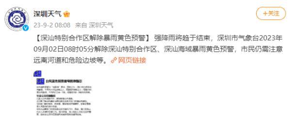【深汕特別合作區解除暴雨黃色預警】強降雨將趨于結束,深圳市氣象臺2023年09月02日08時05分解除深汕特別合作區、深汕海域暴雨黃色預警,市民仍需注意遠離河道和危險邊坡等。