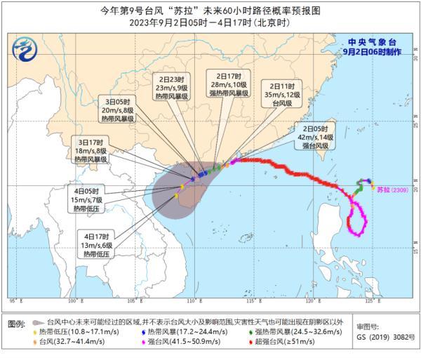 9月2日8時至3日8時,受“蘇拉”影響,南海西北部、北部灣東部、瓊州海峽及廣東沿海、廣西南部沿海、珠江口以及香港和澳門等地將有7—9級、陣風10—11級的大風,“蘇拉”中心經過的附近海面或地區風力有12—13級、陣風14—15級。