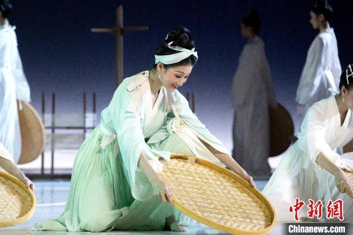 中新網福州9月2日電 (葉秋云)“一眠谷雨前,二眠雨過桑,三眠四眠東風急,累累一春忙”,身著白衣的織絹人在齊舞中將采桑織錦的過程變得富有詩意……9月1日晚,舞蹈詩劇《只此青綠》于福州上演,觀眾沉浸在青綠山水的古典意境中。