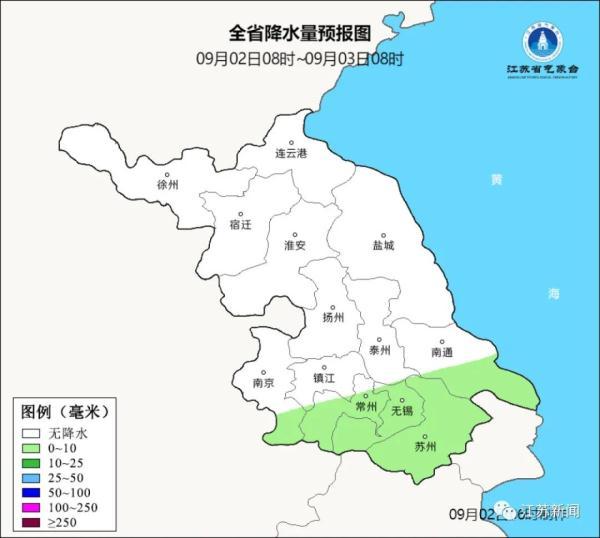 9月02日08時至9月03日08時:白天全省晴到多云,夜里蘇南地區陰有陣雨或雷雨,其他地區多云。最高溫度:全省29℃左右;最低溫度:淮北北部地區20℃左右,本省東南部地區23℃左右,其他地區21~22℃。全省東北風4-5級。