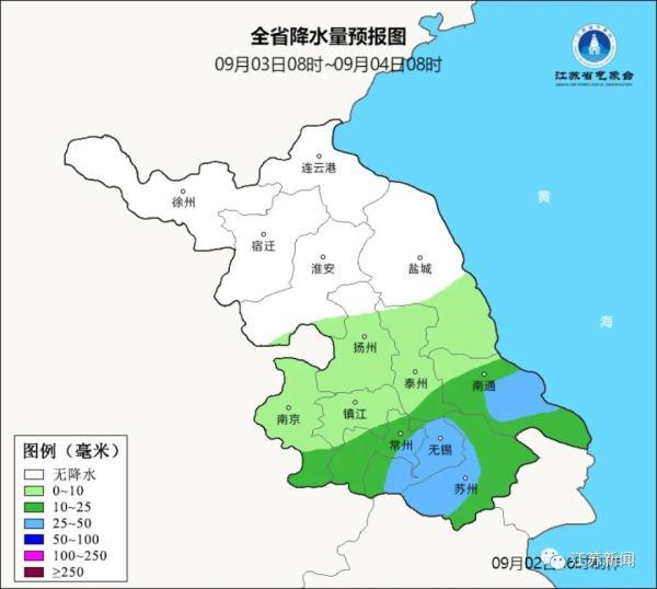 9月03日08時至9月04日08時:江淮之間南部和蘇南地區陰有陣雨或雷雨,其中本省東南部地區雨量中等,局部大雨,其他地區多云。最高溫度:沿淮和蘇南地區26℃左右,其他地區28~29℃;最低溫度:淮北地區19~20℃,本省東南部地區24℃左右,其他地區22~23℃。全省東北風4-5級。