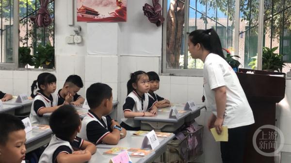 正式上課前,馮老師從一日常規、課間活動規范開始,對孩子們進行基本行為習慣的訓練。“看老師!”跟著老師的要求,挺直了背,把雙手交叉放在課桌前,目不轉睛地盯著老師。
