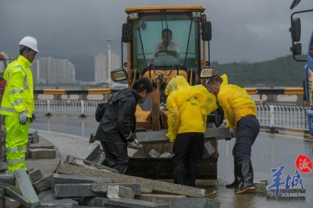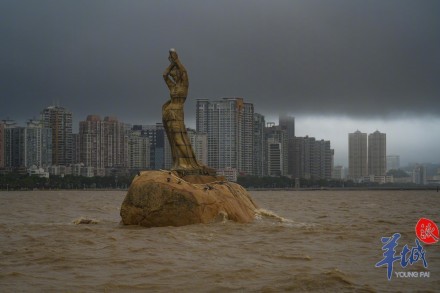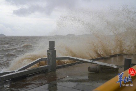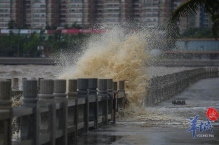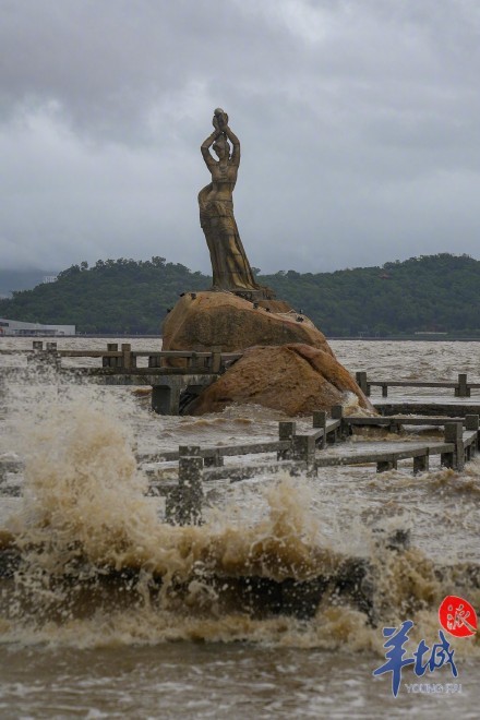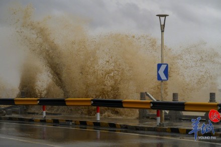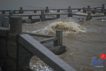 2日早上8時許,珠海市情侶路沿岸風急浪高,時有兩三米高的巨浪拍打上岸,景點漁女雕像底下的親水平臺已被水淹沒。情侶路上有樹木倒伏,部分欄桿受損,應急人員已開展清理工作。