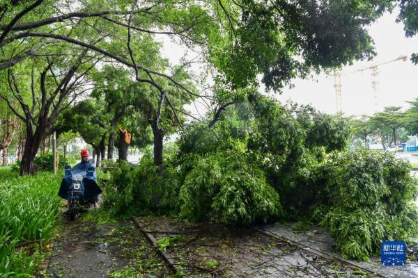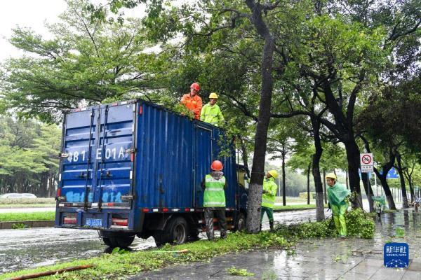 9月2日,在廣東深圳主干道深南大道邊,綠化工人冒雨清理樹(shù)枝。