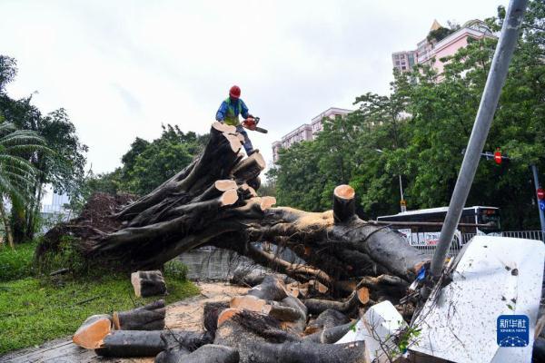 9月2日,在深圳主干道深南大道邊,綠化工人冒雨清理倒伏的大樹(shù)。