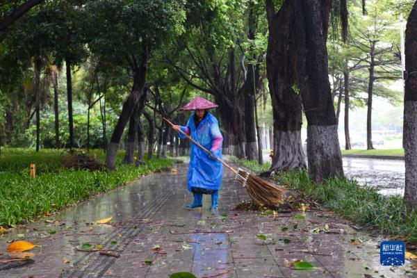 9月2日,在深圳主干道深南大道邊,環(huán)衛(wèi)工人冒雨清理樹(shù)葉。