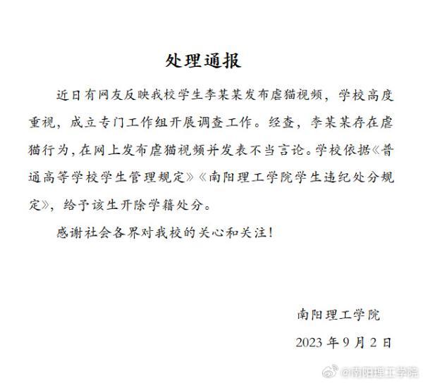 央視網消息:9月2日,@南陽理工學院發布處理通報稱,近日有網友反映我校學生李某某發布虐貓視頻,學校高度重視,成立專門工作組開展調查工作。經查,李某某存在虐貓行為,在網上發布虐貓視頻并發表不當言論。學校依據《普通高等學校學生管理規定》《南陽理工學院學生違紀處分規定》,給予該生開除學籍處分。