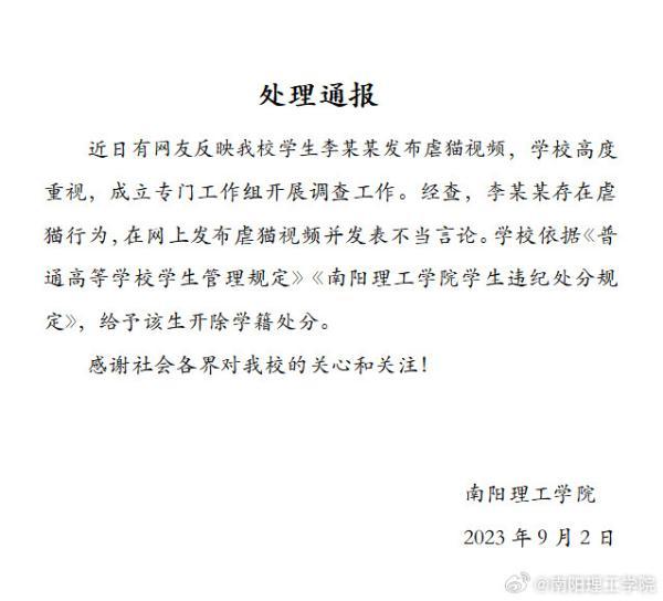 9月2日,@南陽理工學院發布處理通報:近日有網友反映我校學生李某某發布虐貓視頻,學校高度重視,成立專門工作組開展調查工作。經查,李某某存在虐貓行為,在網上發布虐貓視頻并發表不當言論。學校依據《普通高等學校學生管理規定》《南陽理工學院學生違紀處分規定》,給予該生開除學籍處分。