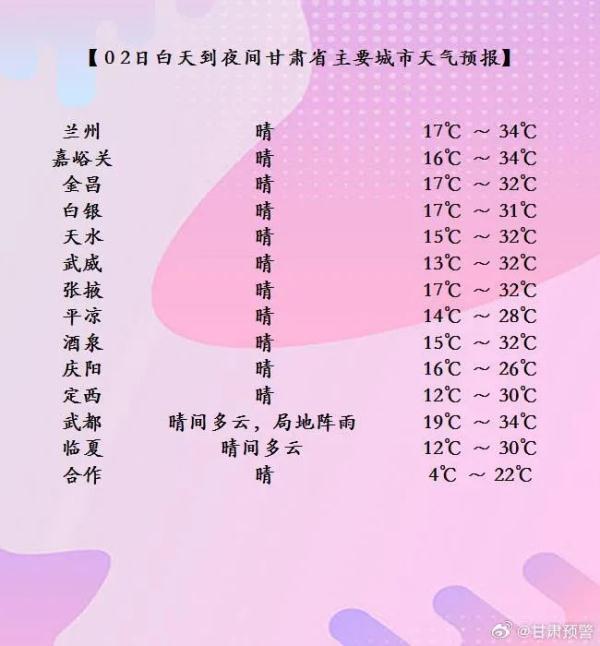 9月2日白天,甘南、平?jīng)觥c陽三州市多云,局部地方陰有陣雨或雷陣雨;省內(nèi)其余地方晴或多云。
