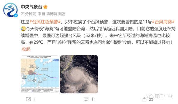 @中央氣象臺:還是臺風紅色預警,只不過換了個臺風預警,這次要警惕的是11號臺風海葵。今天傍晚“海葵”有可能登陸臺灣,然后繼續趨近我國大陸,目前它的強度還在持續增強中,最強可達超強臺風級(52米/秒)。未來它所經過的海域海溫也比較高,有29℃,而且“蘇拉”殘留的云系也有可能被“海葵”收編,所以不能掉以輕心!
