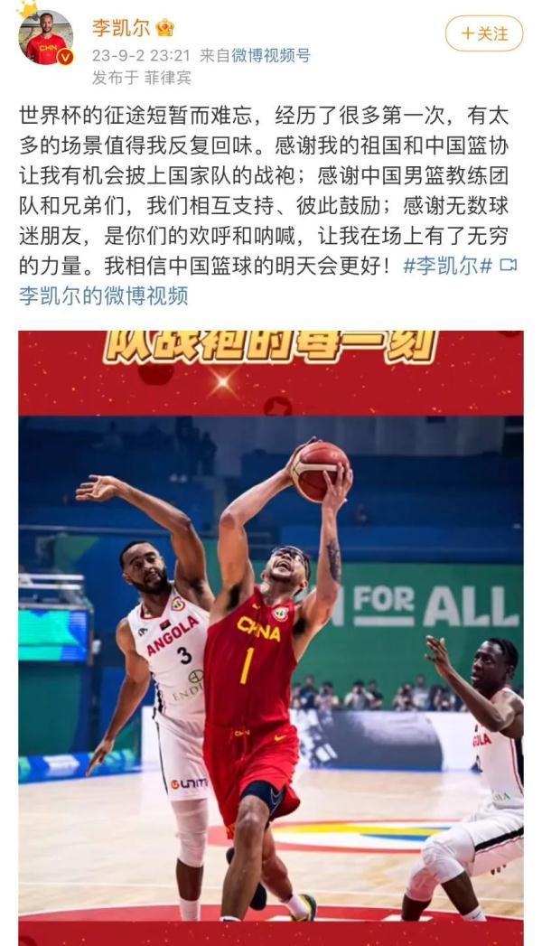 中國男籃隊員@李凱爾深夜發布微博:世界杯的征途短暫而難忘,經歷了很多第一次,有太多的場景值得我反復回味。感謝我的祖國和中國籃協讓我有機會披上國家隊的戰袍;感謝中國男籃教練團隊和兄弟們,我們相互支持、彼此鼓勵;感謝無數球迷朋友,是你們的歡呼和吶喊,讓我在場上有了無窮的力量。我相信中國籃球的明天會更好!