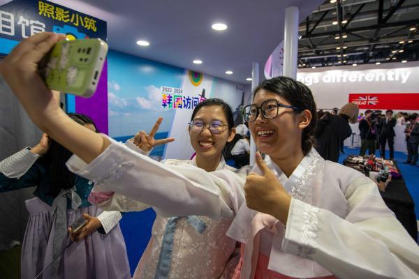 9月2日,在位于國家會(huì)議中心的韓國展臺(tái),參觀者試穿韓服拍照留念。人民網(wǎng)記者 翁奇羽攝