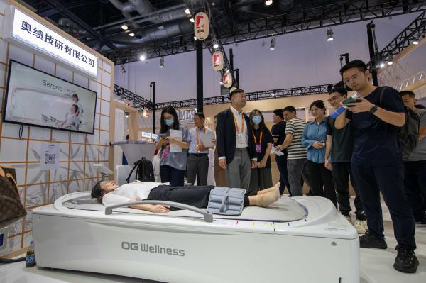9月2日,在位于國家會(huì)議中心的日本展臺(tái),觀眾正在體驗(yàn)水壓按摩床。人民網(wǎng)記者 翁奇羽攝
