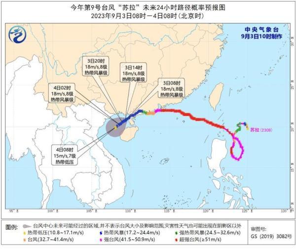 另外,今年第9號臺風“蘇拉”(SAOLA)(熱帶風暴級)的中心于今天(9月3日)上午8點鐘前后由廣東湛江移入北部灣海面,上午10點鐘其中心位于北緯20.9度、東經109.5度的海面上,最大風力有8級(18米/秒),中心最低氣壓為998百帕,七級風圈半徑30-50公里。