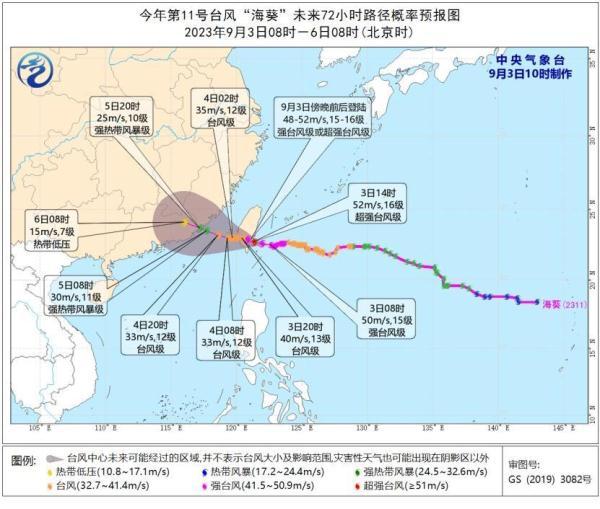 大風預報:9月3日14時至4日14時,受“蘇拉”影響,北部灣和廣西南部沿海將有6-7級大風,其中北部灣北部部分海域將有8級、陣風9-10級的大風;受“海葵”影響,巴士海峽、臺灣海峽、臺灣以東洋面、東海南部及釣魚島附近海域、南海東北部偏東海域以及浙江南部沿海、福建沿海、廣東東部偏東地區沿海、臺灣島沿海將有6-8級、陣風9-10級大風,部分海域或地區的風力有9-12級,陣風13-14級,“海葵”中心經過的附近海面或地區的風力有13-16級,陣風16-17級。