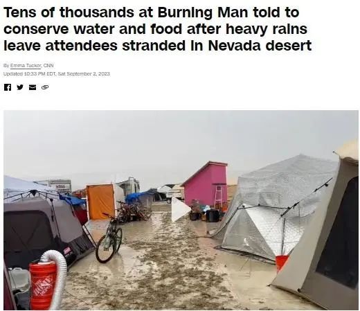 據(jù)美國有線電視新聞網(wǎng)(CNN)報道,當?shù)貢r間2日,美國內華達州黑巖沙漠突降暴雨,數(shù)萬名到此地參加“火人節(jié)”的游客被困沙漠中。