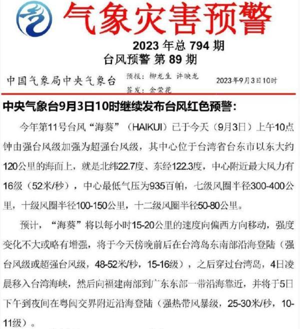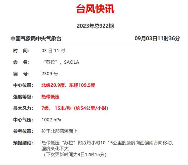據@海珠天氣消息,“??保ǔ瑥娕_風級)9月3日09時中心位于距離海珠區東偏南方向約950公里的海面上,也就是北緯22.5度、東經122.5度,中心附近最大風力15級(50米/秒),中心最低氣壓940百帕。