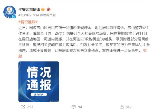 據@平安北京房山微博9月3日通報,近日,網傳房山區周口店鎮一河道內出現碎金,附近居民前往淘金。房山警方經工作查明,隗某某(男,26歲)為提升個人社交賬號熱度,網購黃銅顆粒于9月1日在周口店地區一河道內拋撒,并在河邊以“收購黃金”為噱頭,吸引附近部分居民前往撿拾?,F場相關視頻在網上傳播后,引發社會關注。隗某某的行為嚴重擾亂社會秩序,造成不良影響,已被房山警方刑事立案偵查。案件正在進一步調查中。