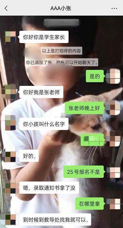 8月23日晚上,家長(zhǎng)群里名叫“AAA小張”的人主動(dòng)添加王女士為微信好友。對(duì)方自稱是“張老師”,詢問(wèn)了小孩的姓名和基本情況,還告知王女士25號(hào)到教導(dǎo)處找他拿錄取通知書(shū)。由于轉(zhuǎn)學(xué)需要戶口簿等相關(guān)證件原件,“張老師”還特別貼心地囑咐王女士讓人盡快從老家快遞郵寄過(guò)來(lái)。