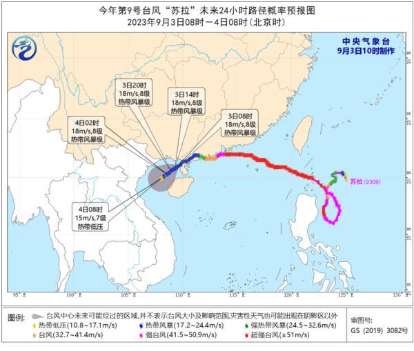 另外,今年第9號臺風“蘇拉”(SAOLA)(熱帶風暴級)的中心于今天(9月3日)上午8點鐘前后由廣東湛江移入北部灣海面,上午10點鐘其中心位于北緯20.9度、東經109.5度的海面上,最大風力有8級(18米/秒),中心最低氣壓為998百帕,七級風圈半徑30-50公里。